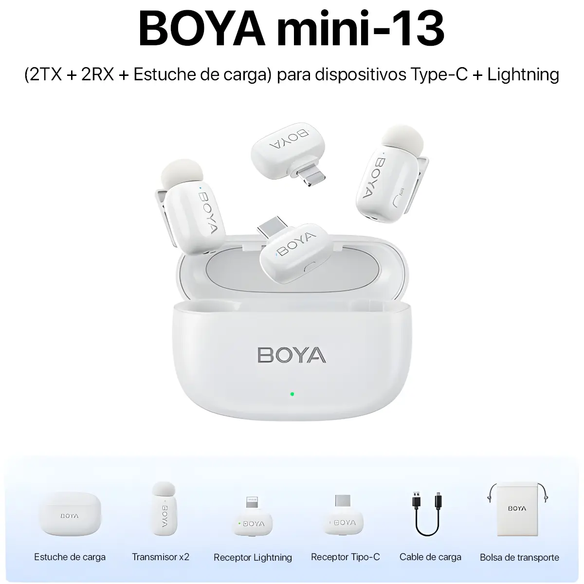 El BOYA Mini‑13 Micrófono Inalámbrico Dual USB‑C y Lightning (Blanco) es un sistema ultracompacto que incluye dos transmisores y dos receptores, diseñados para grabación profesional en móviles. Con conectores USB‑C y Lightning plug-and-play, ofrece audio nítido con cancelación de ruido y gran autonomía para entrevistas, vlogs y clases.