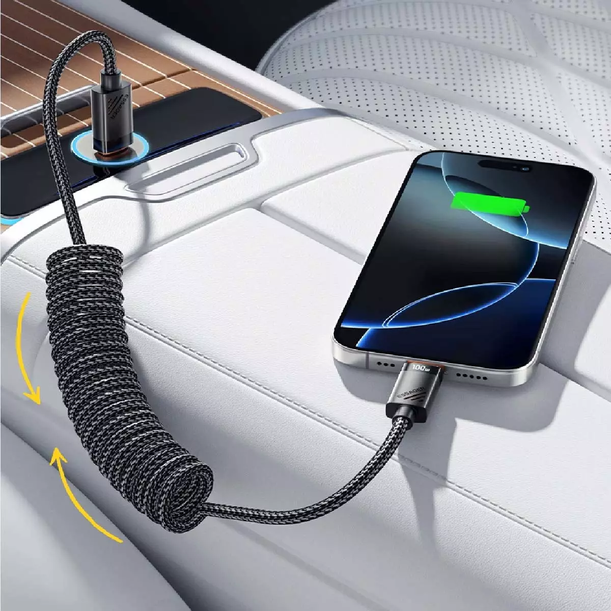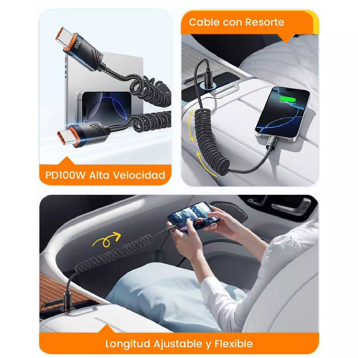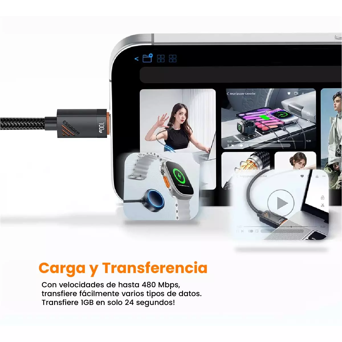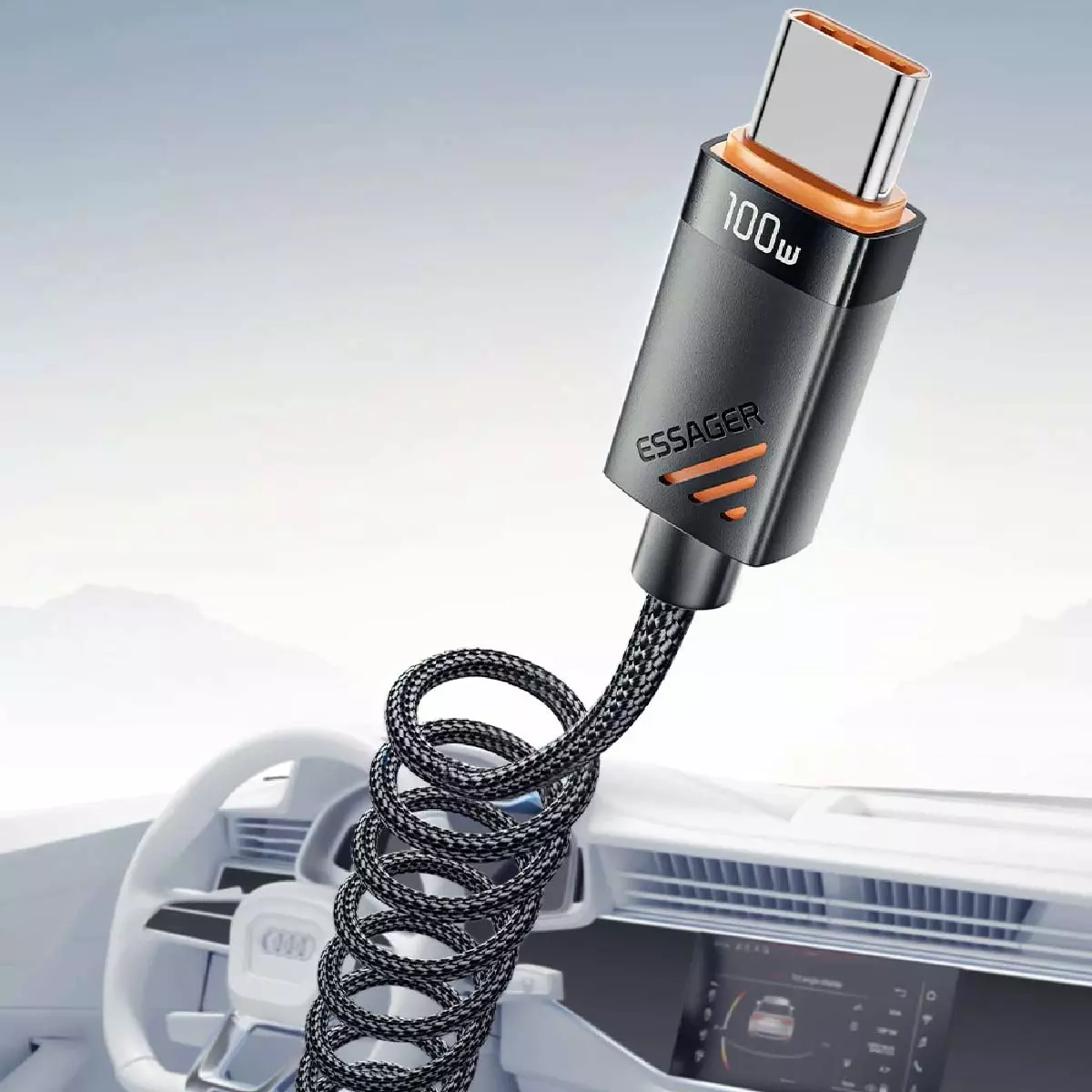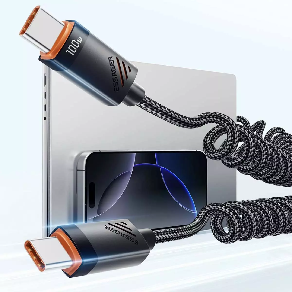 El cable Essager USB C a USB C soporta 5 amperios y 100W de potencia, garantizando una carga ultrarrápida y segura en dispositivos compatibles. Perfecto para laptops, tablets y smartphones de última generación que requieren alta potencia.
