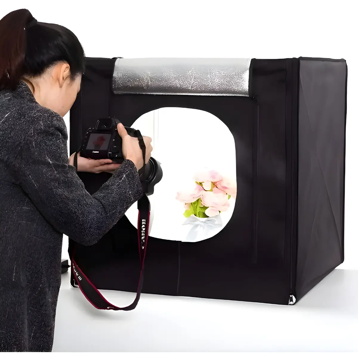 Con un tamaño de 80 x 80 cm, esta caja de luz es perfecta para fotografiar desde pequeños accesorios hasta productos medianos como zapatos, bolsos, dispositivos electrónicos e incluso decoración. Su amplitud brinda flexibilidad para distintos ángulos y encuadres.