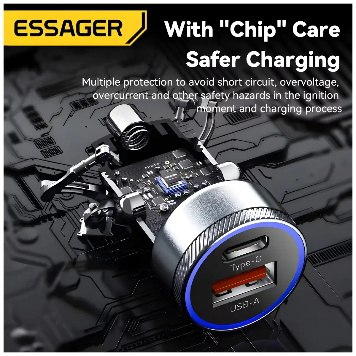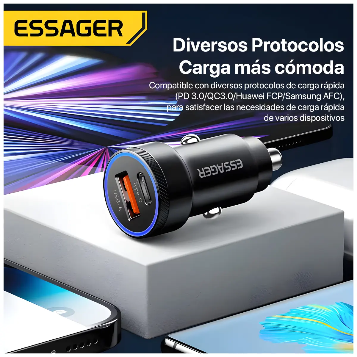 - Marca: Essager 100% Original – Cargador de coche 54W carga rápida 3,0 USB Y tipo C –