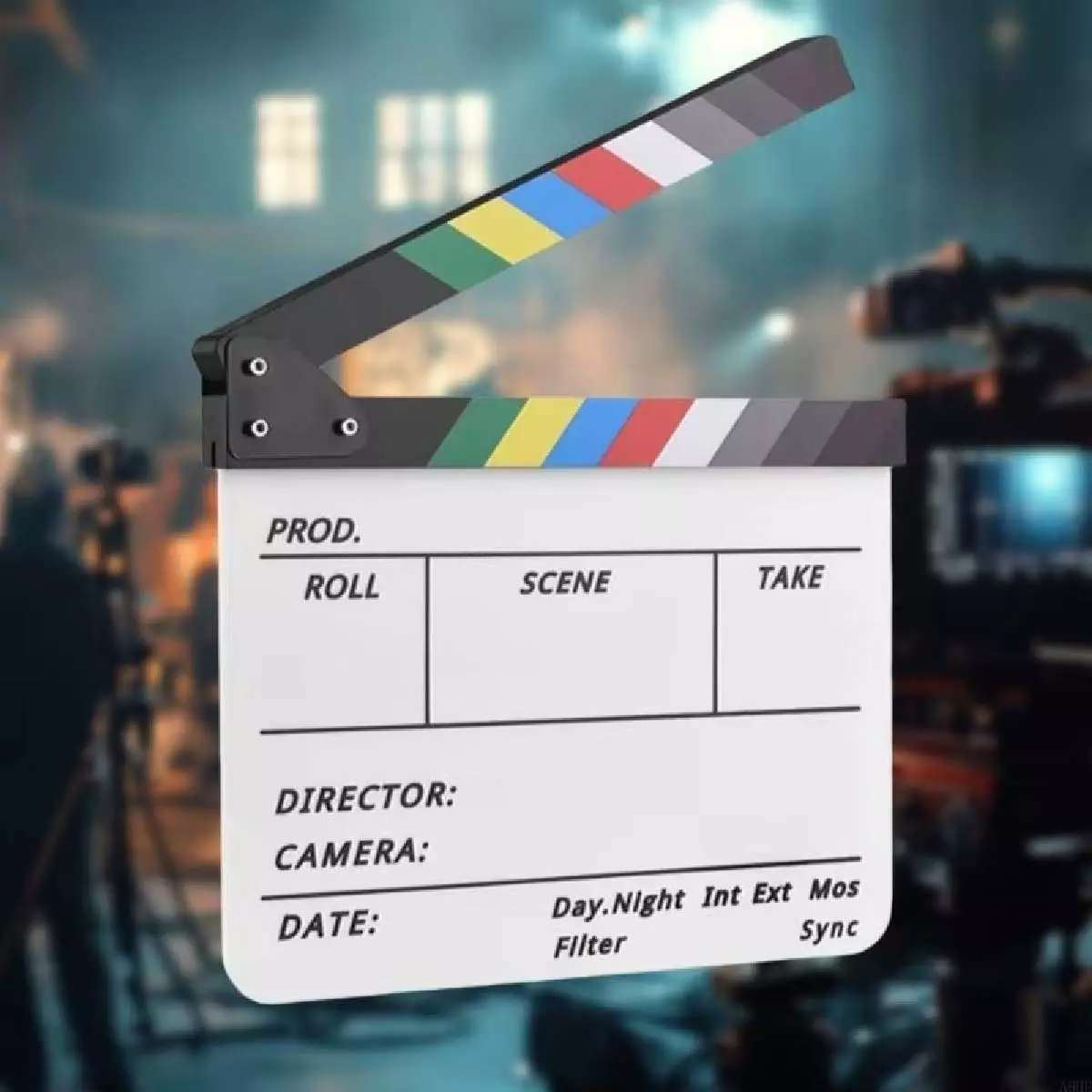 Claqueta acrílica profesional para grabación de videos, ideal para cine, cortometrajes y producciones audiovisuales. Reutilizable, ligera y fácil de usar en rodajes.
