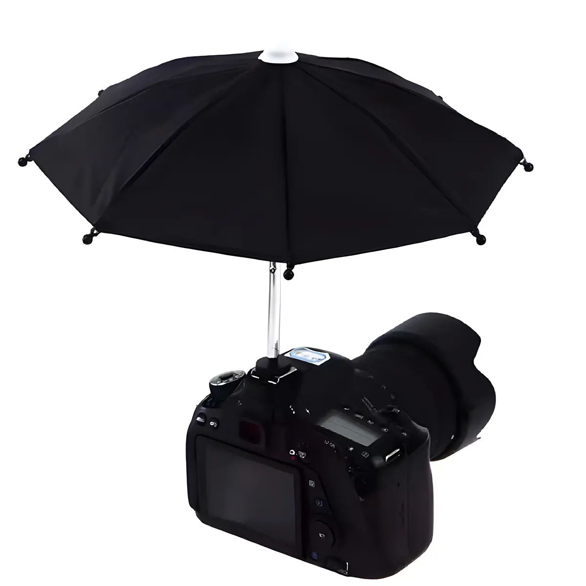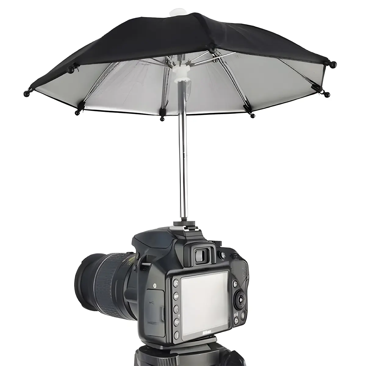 El mini paraguas para cámara resguarda tu equipo fotográfico frente a salpicaduras de agua y exposición directa al sol, evitando daños en la lente y mejorando la calidad de las tomas en exteriores.