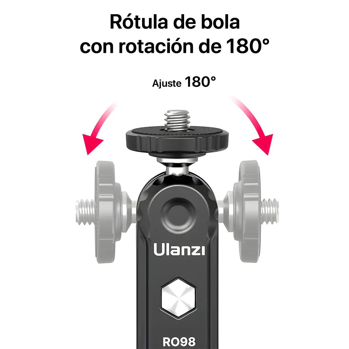 La Ulanzi R098 incorpora dos rótulas que permiten una rotación completa de 360°, ofreciendo una amplia gama de ángulos de ajuste para posicionar los accesorios según las necesidades del usuario. Estas rótulas se bloquean simultáneamente mediante una única perilla, lo que facilita un ajuste rápido y seguro, asegurando que los dispositivos permanezcan en la posición deseada durante su uso.