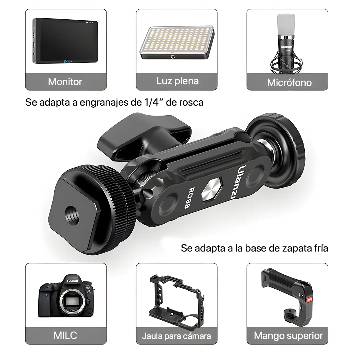 - Marca: Ulanzi 100% Original – Montura Doble Rótula Ulanzi R098 Zapata Fría y Rosca 1/4″ –