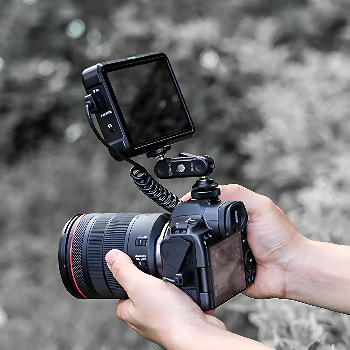La base de la montura combina una interfaz de zapata fría (cold shoe) y un puerto de rosca de 1/4″, lo que permite su instalación en una variedad de equipos, incluyendo cámaras DSLR, soportes y rigs. Esta versatilidad en la base facilita la integración de la montura en diferentes configuraciones de trabajo, adaptándose a las necesidades específicas de cada proyecto.